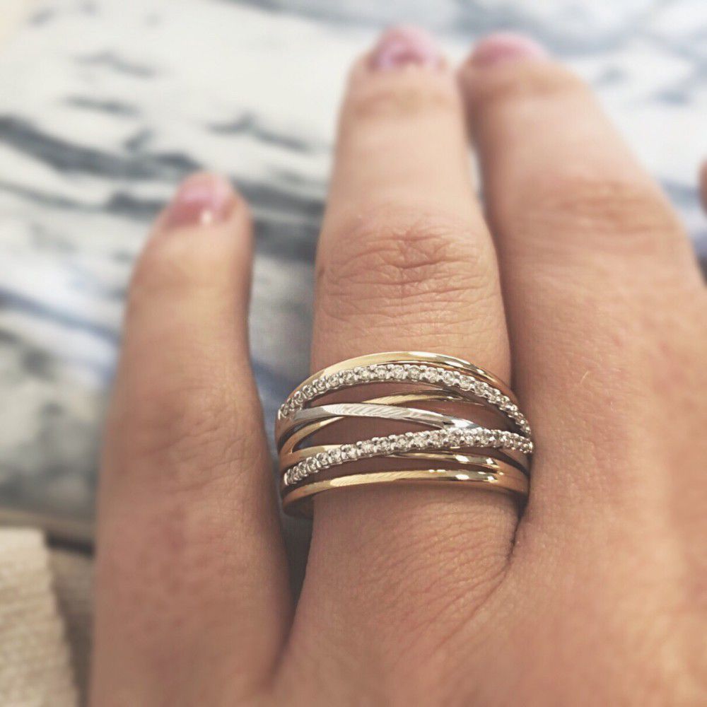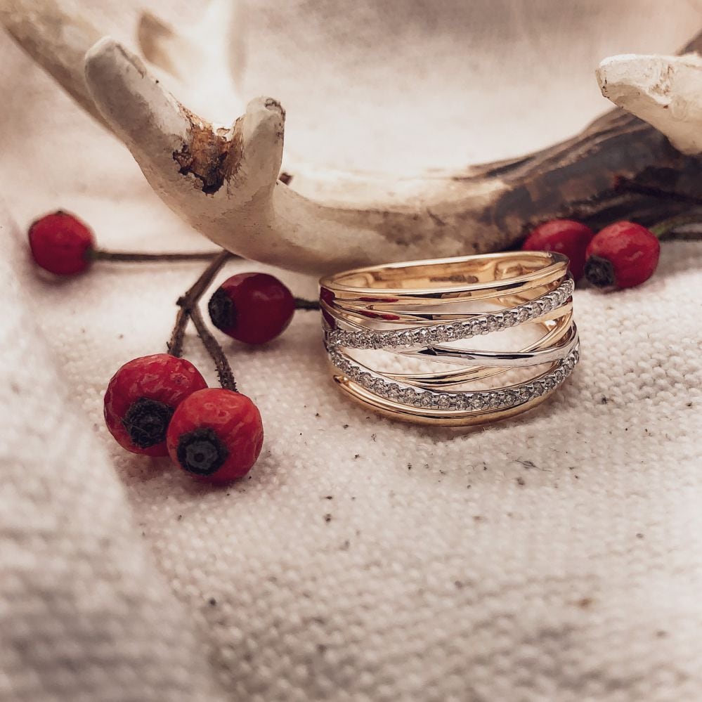 14 Karaat bicolor geel- met witgouden dames fantasie ring Crossover met 0.27 crt briljant.