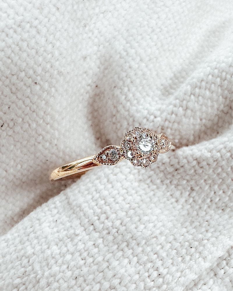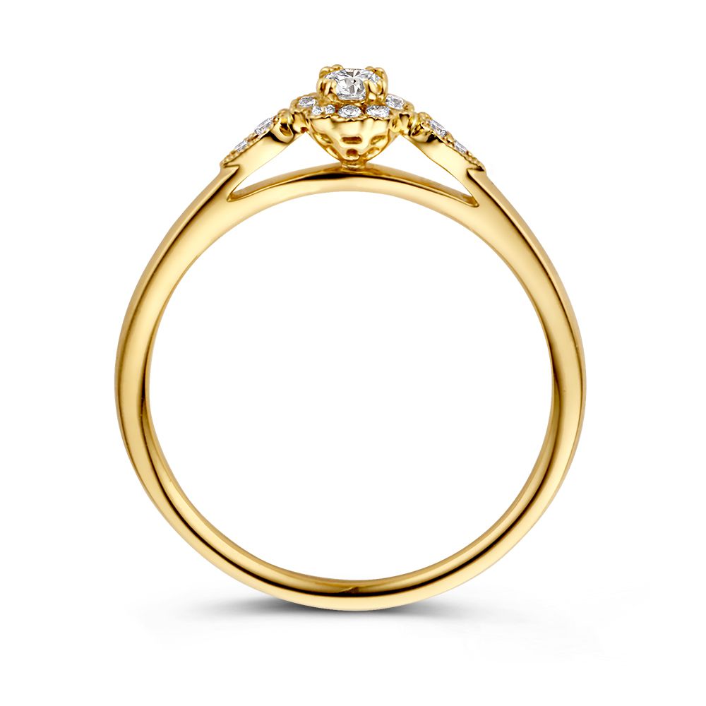 14 Karaat geel gouden dames Vintage ring met briljant in entourage zetting en zijsteentjes.