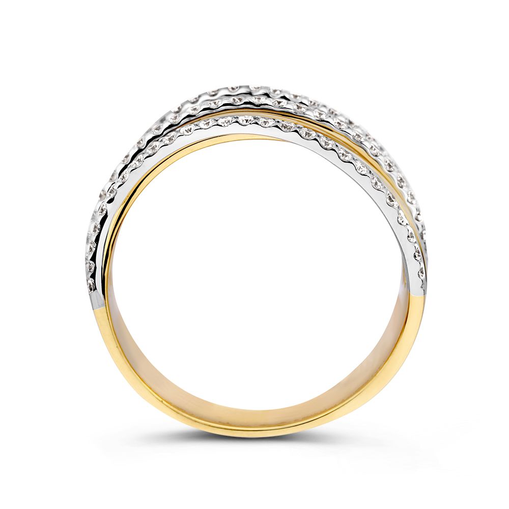 Schitterende geel- met witgouden ring in een massieve uitvoering. De verschillende a-symmetrische banen geven de ring een uniek design, de fonkelende diamanten maken het luxe gevoel compleet. De ring is bovendien zo ontworpen dat hij vlak op de vinger blijft, waardoor hij een hoog draagcomfort heeft.