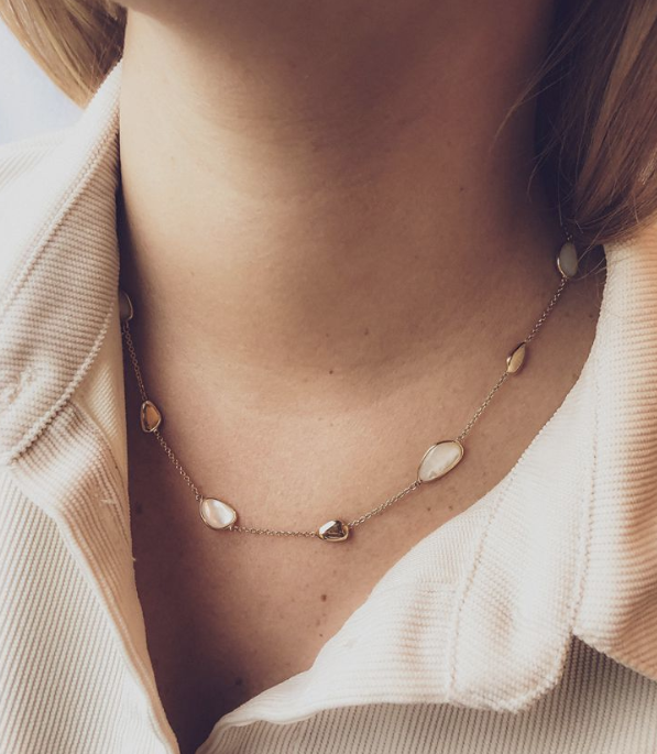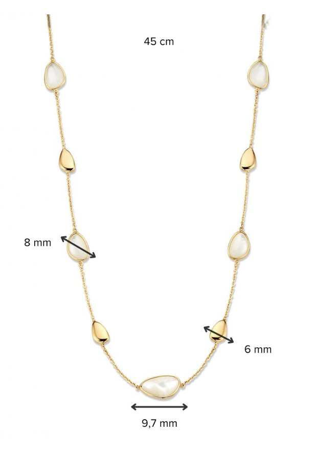 Geelgouden collier met natuurlijk parelmoer in organische vormen.