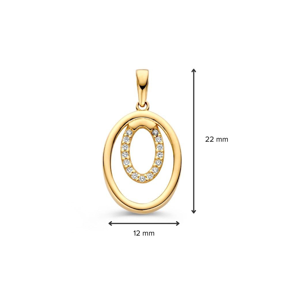 14 Karaat geelgouden hanger van twee met elkaar verbonden ovale circkels. De binnenste cirkel is gezet met zirkonia's.