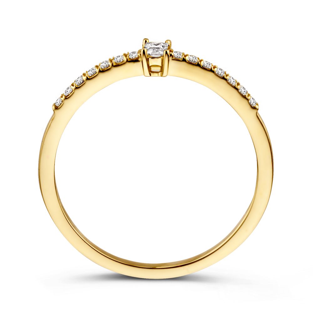 14 karaat geel gouden solitair ring met zijstenen met Zirkonia's.