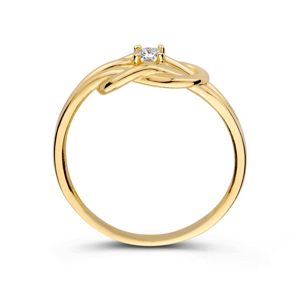 Speelse, geelgouden ring met een knoop. De ring is gezet met een fonkelende zirkonia.