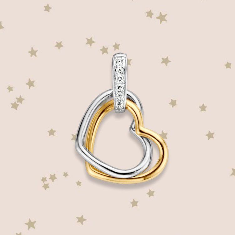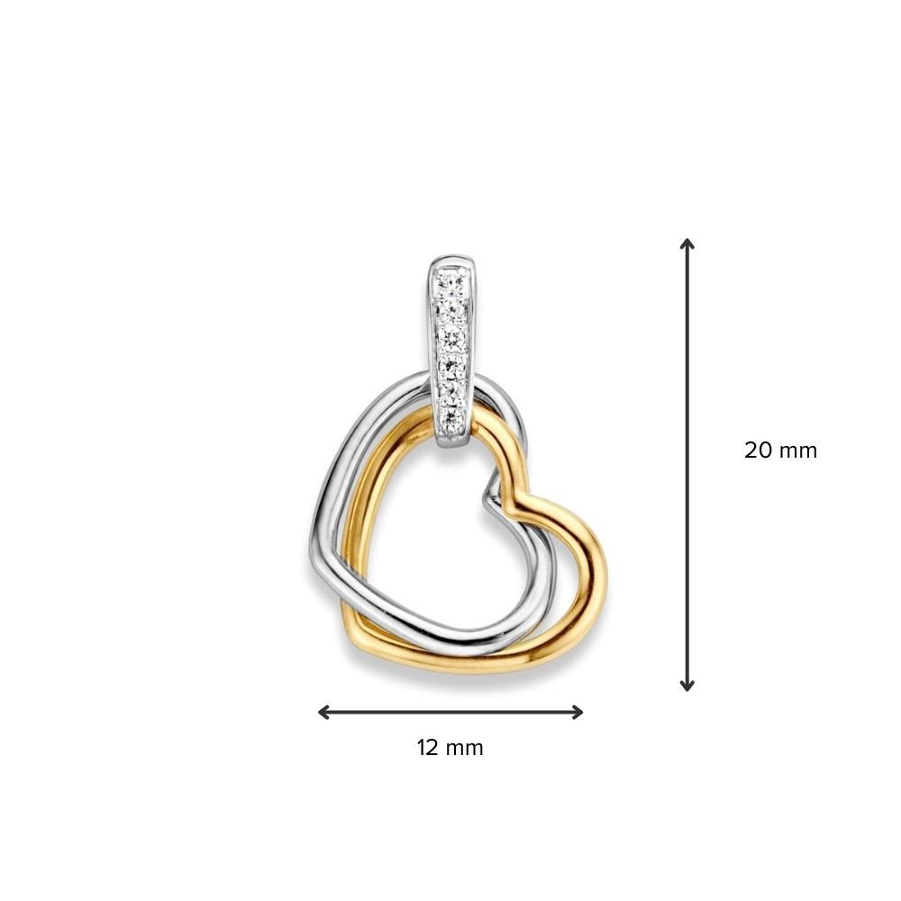 14 karaat Bicolor wit- en geelhanger met dubbel hart. De lus van de hanger is voorzien van zirkonia's.