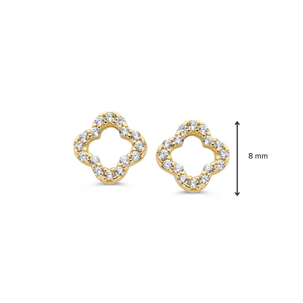 Geelgouden oor stekers in open bloemvorm, gezet met fijne zirkonia's.