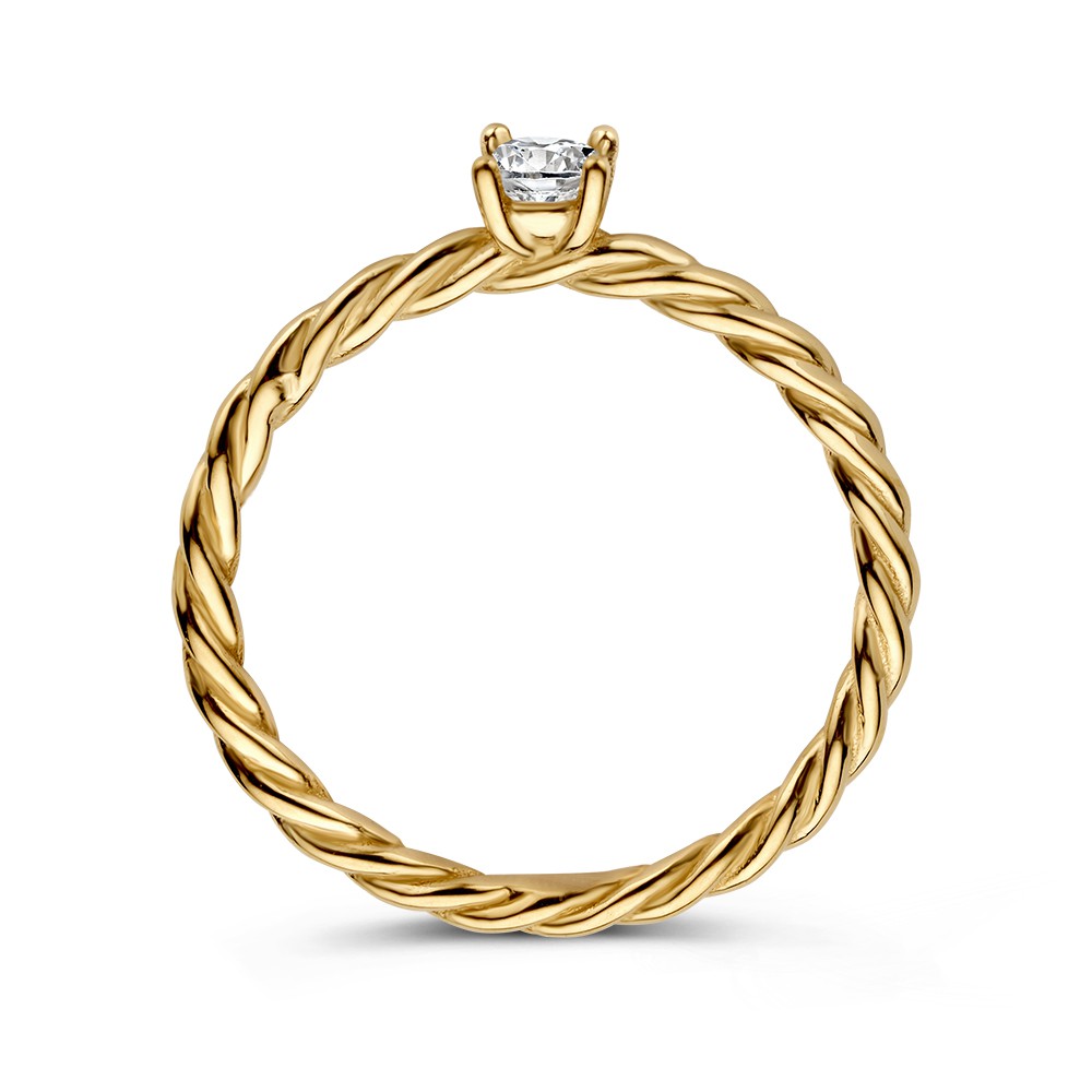 Gouden solitairring met gedraaide band en zirkonia.