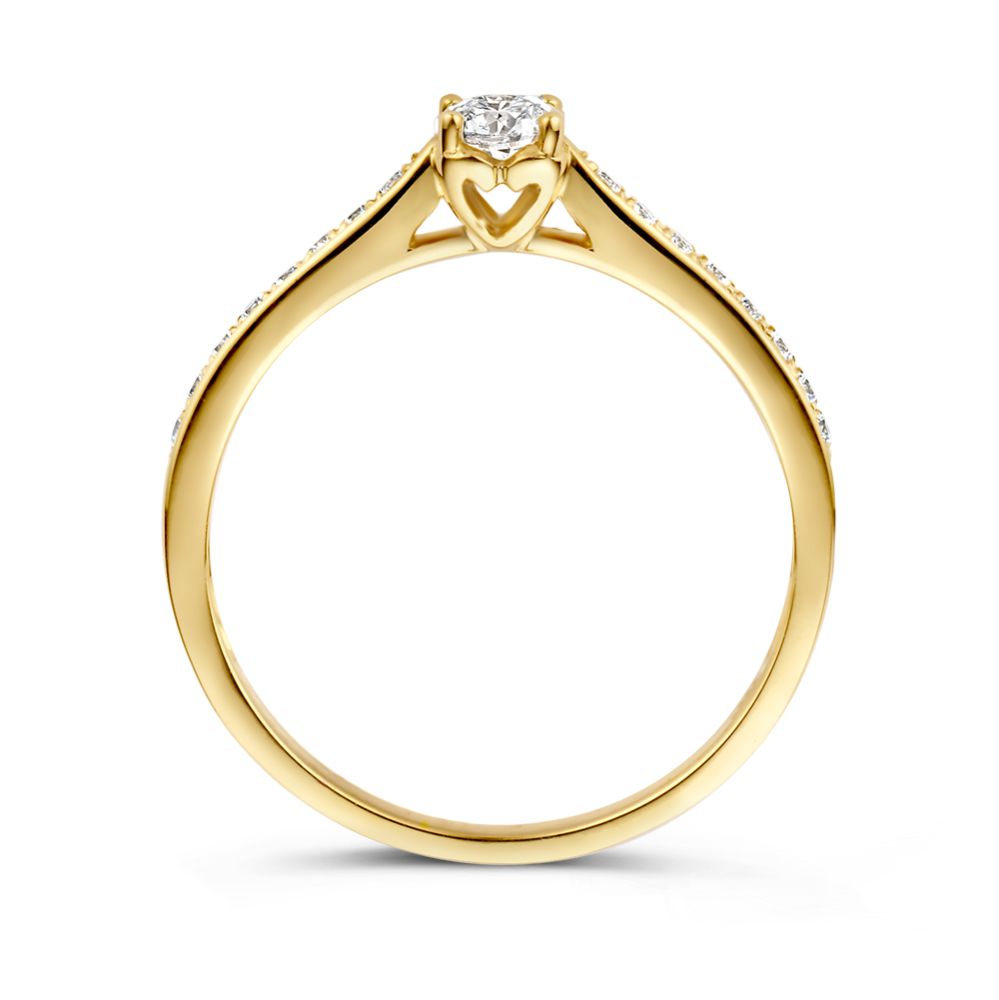 14 karaat geel gouden solitair ring met zijstenen met Zirkonia's.