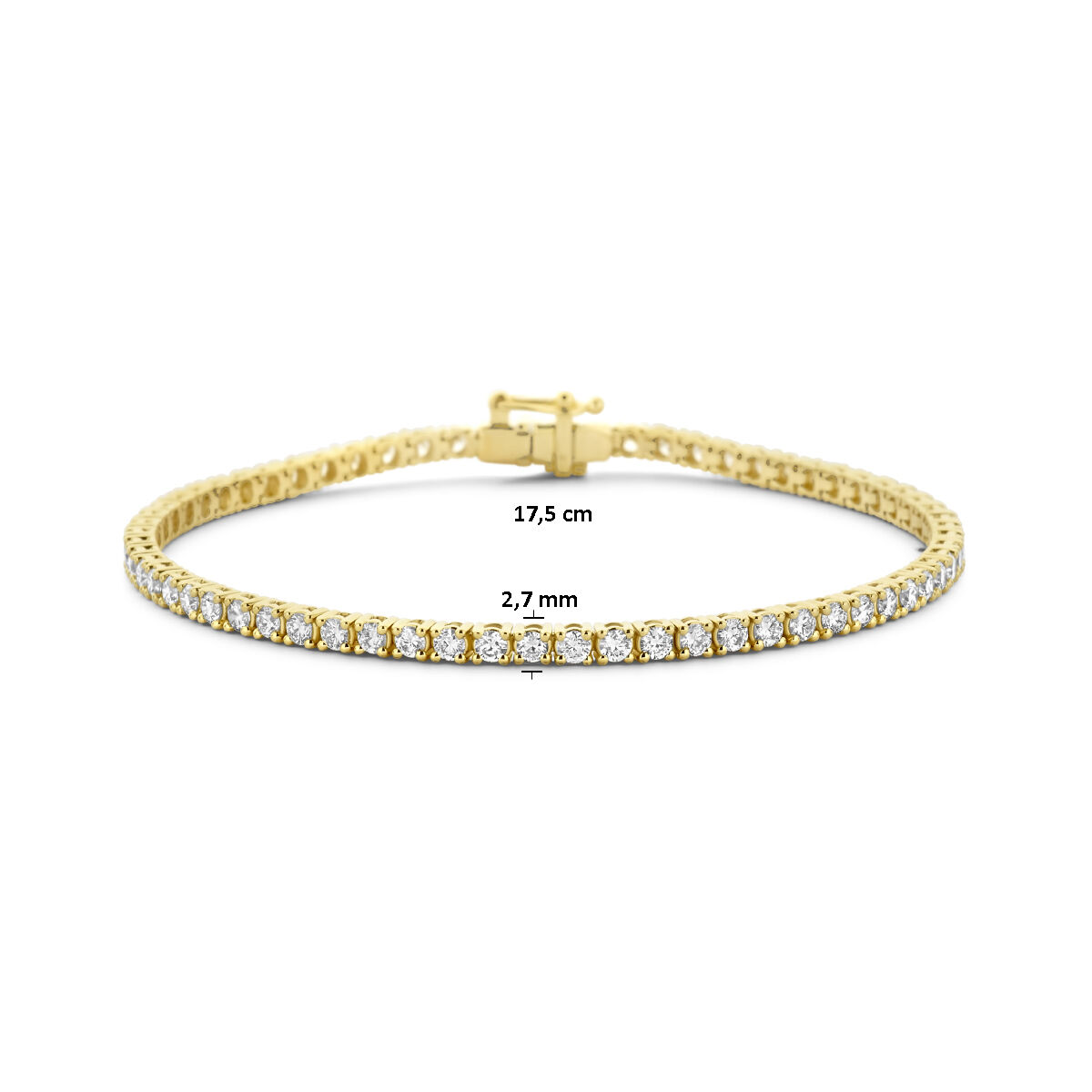 14k Geelgouden tennisarmband uitgevoerd met schitterende lab grown diamanten. De tennisarmband heeft een draaglengte van 17.5cm en een schakelbreedte van 2.7mm. Het diamantgewicht is 3.00ct. Lab grown diamanten zijn diamanten die ontstaan in een laboratorium. Onder extreem hoge druk en temperatuur wordt het natuurlijk ontstaansproces nagebootst met als eindresultaat een diamant met dezelfde chemische eigenschappen maar met een andere oorsprong.
