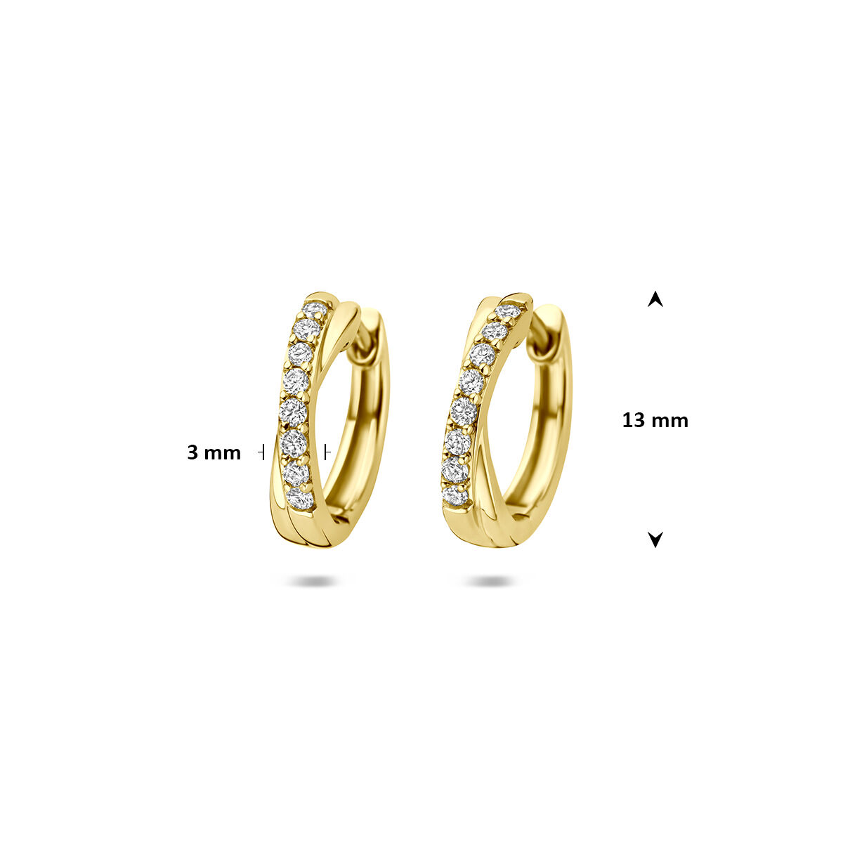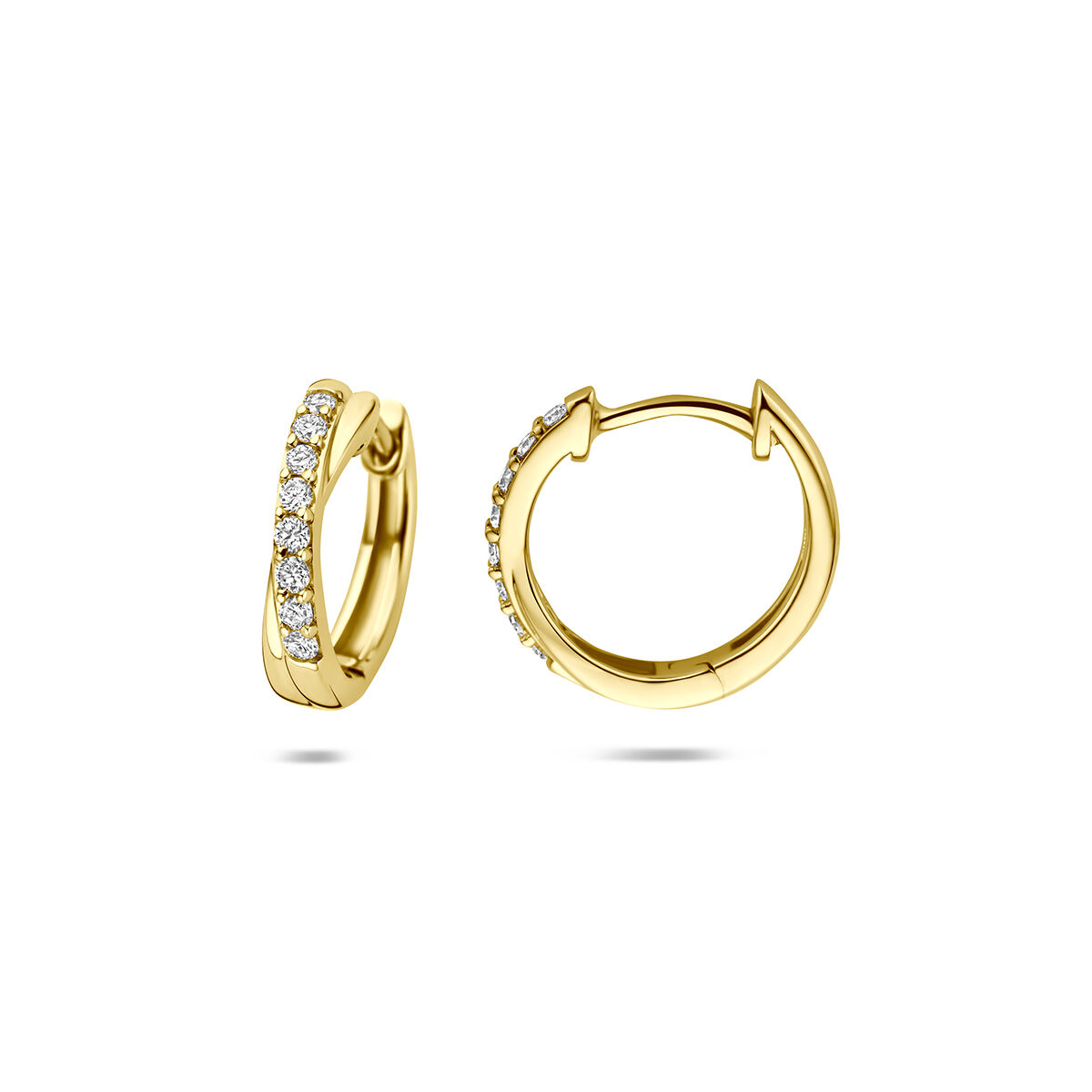 14k Geelgouden klapoorringen uitgevoerd met lab grown diamant. De klapoorringen hebben een afmeting van 13x3mm. Het totale diamantgewicht is 0.20ct.