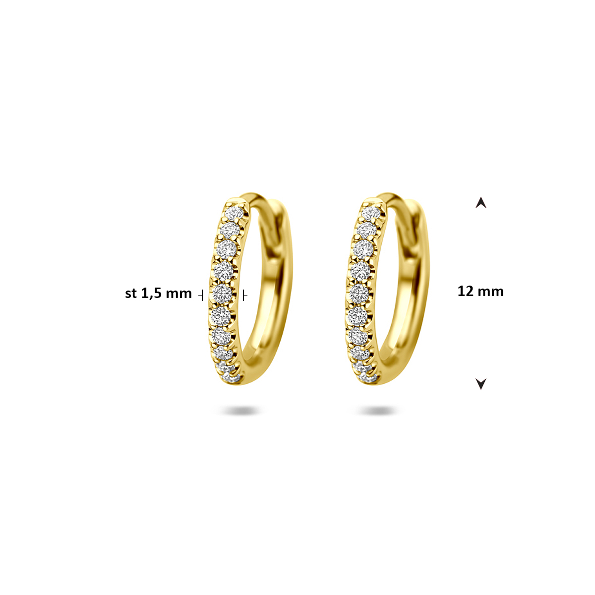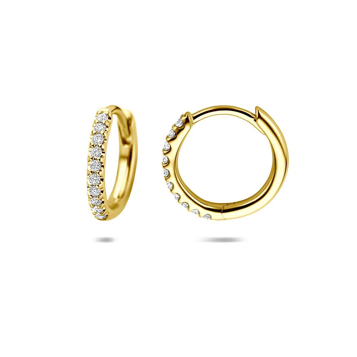 14k Geelgouden klapoorringen uitgevoerd met lab grown diamant. De klapoorringen hebben een diameter van 12mm. Het totale diamantgewicht is 0.14ct. Lab grown diamanten zijn diamanten die ontstaan in een laboratorium. Onder extreem hoge druk en temperatuur wordt het natuurlijk ontstaansproces nagebootst met als eindresultaat een diamant met dezelfde chemische eigenschappen maar met een andere oorsprong.