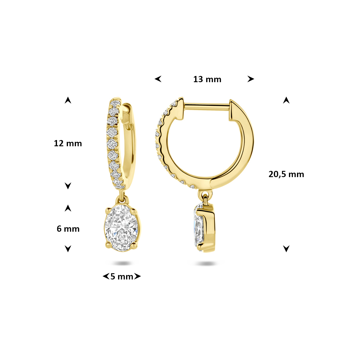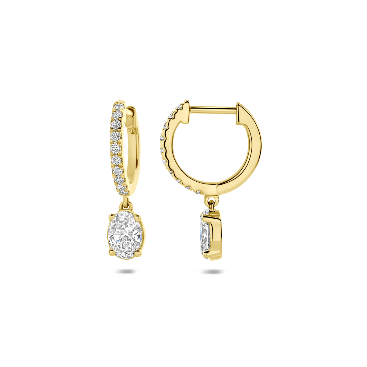 14k Geelgouden klapoorringen uitgevoerd met lab grown diamant. De klapoorringen hebben een totale hoogte van 20.5mm. Het totale diamantgewicht is 2.48ct. Lab grown diamanten zijn diamanten die ontstaan in een laboratorium. Onder extreem hoge druk en temperatuur wordt het natuurlijk ontstaansproces nagebootst met als eindresultaat een diamant met dezelfde chemische eigenschappen maar met een andere oorsprong. Dit artikel wordt geleverd met een certificaat van de diamant.