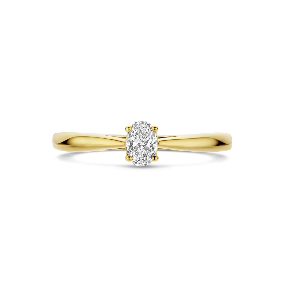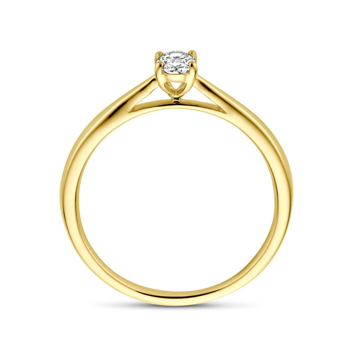 14k Geelgouden ring uitgevoerd met lab grown diamant. De ring heeft een breedte van 5mm. Het diamantgewicht is 0.25ct. Lab grown diamanten zijn diamanten die ontstaan in een laboratorium. Onder extreem hoge druk en temperatuur wordt het natuurlijk ontstaansproces nagebootst met als eindresultaat een diamant met dezelfde chemische eigenschappen maar met een andere oorsprong.
