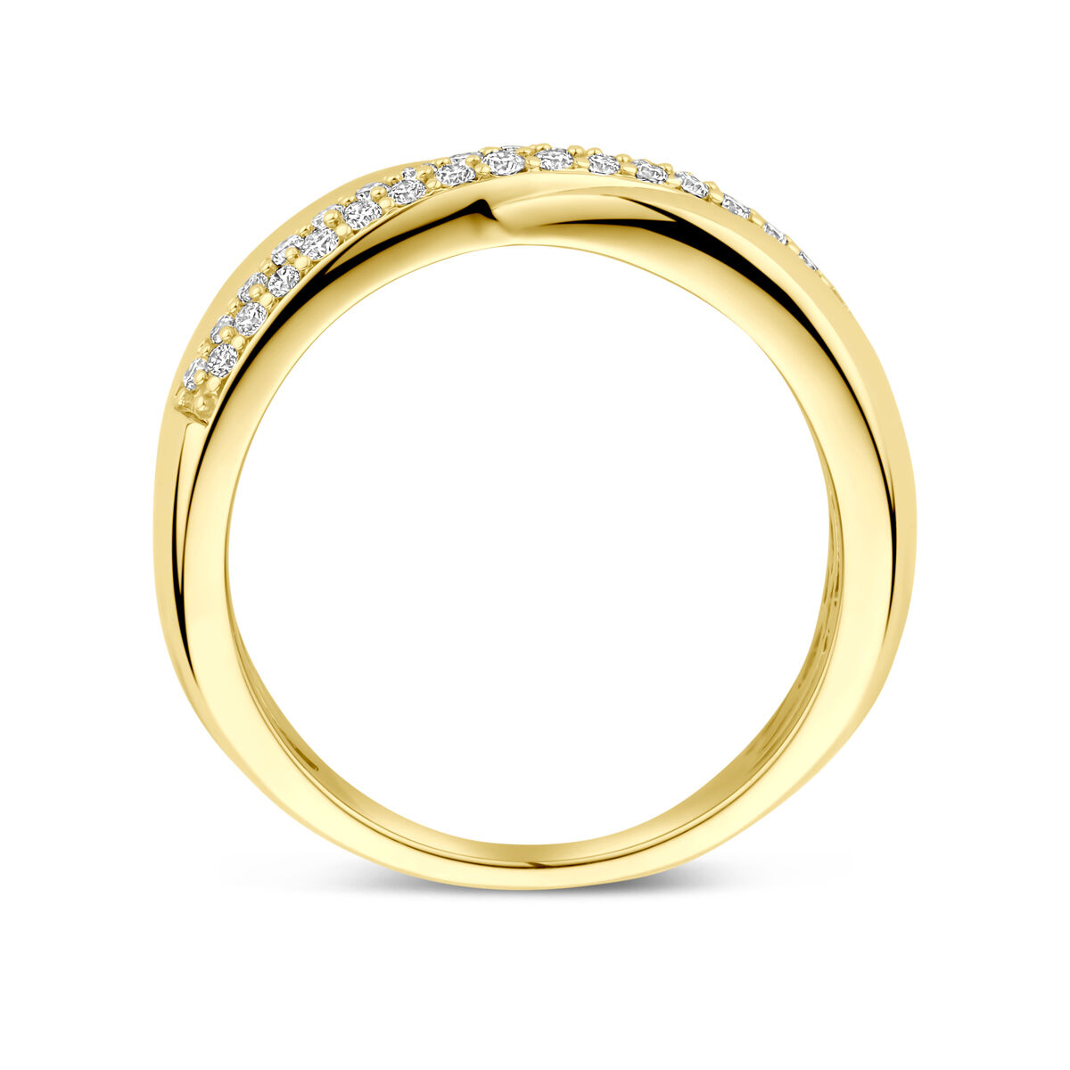 14k Geelgouden ring uitgevoerd met lab grown diamant. De ring heeft een breedte van 7.5mm. Het totale diamantgewicht is 0.30ct. Lab grown diamanten zijn diamanten die ontstaan in een laboratorium. Onder extreem hoge druk en temperatuur wordt het natuurlijk ontstaansproces nagebootst met als eindresultaat een diamant met dezelfde chemische eigenschappen maar met een andere oorsprong.