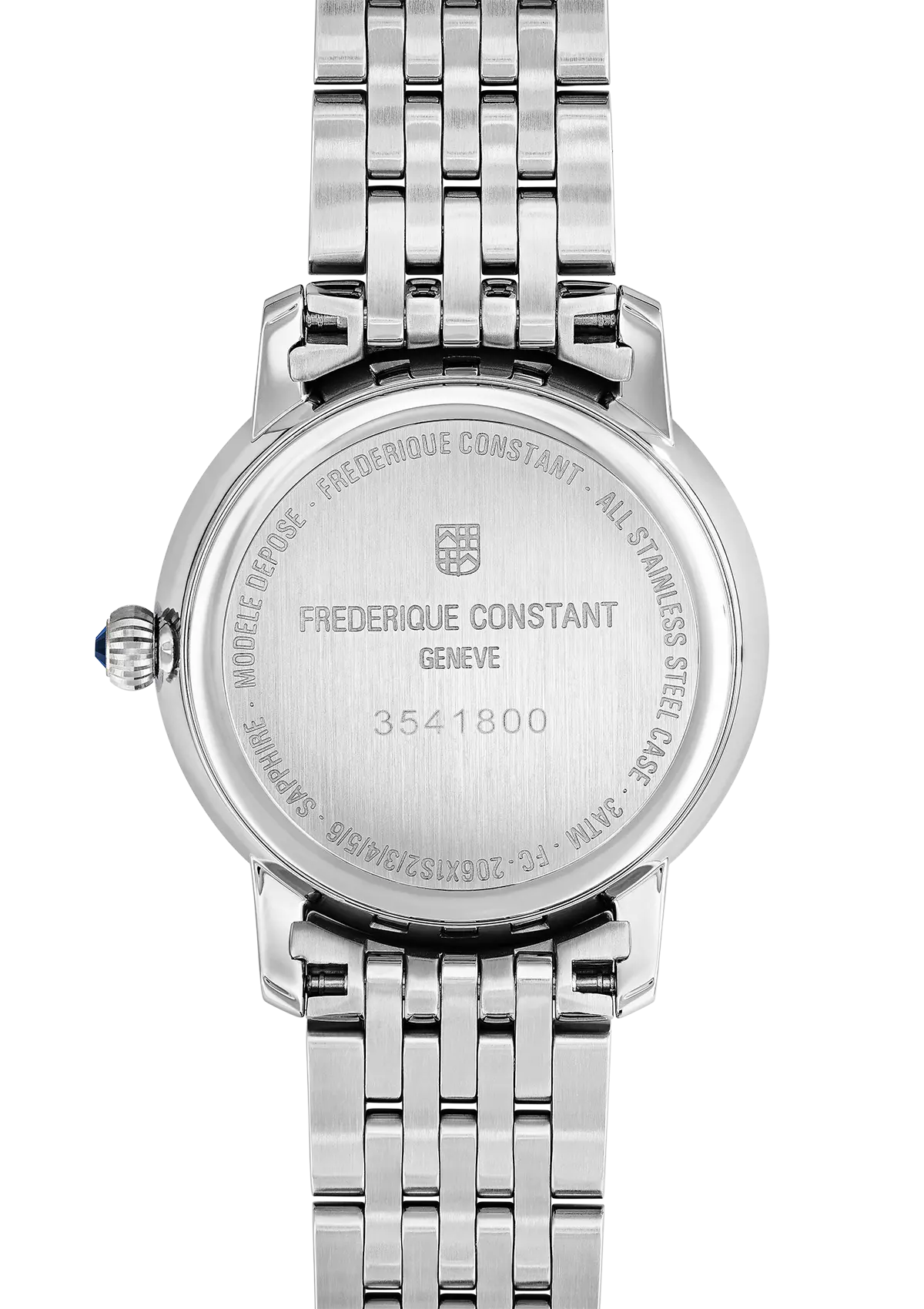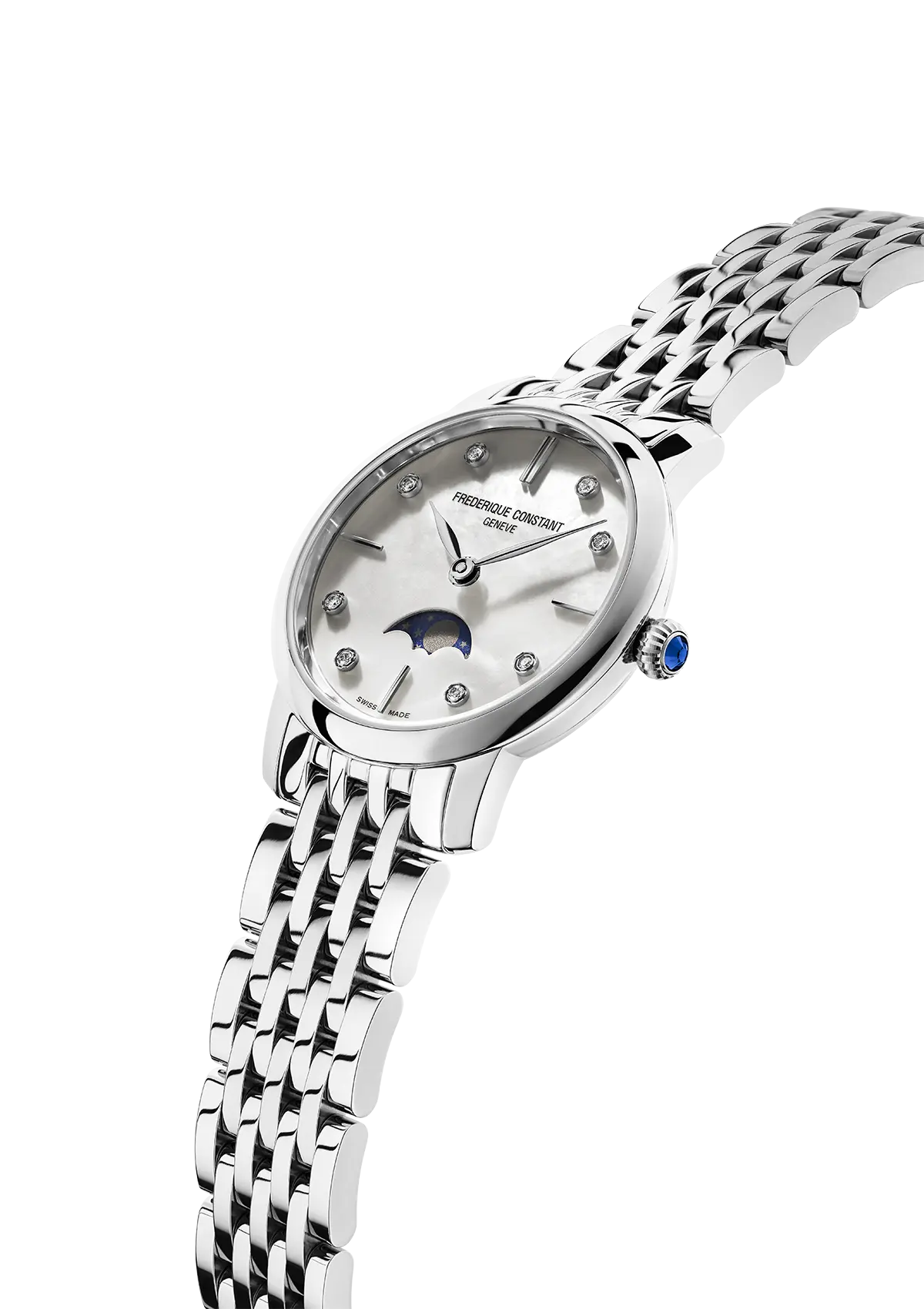 Het klassieke, slanke dameshorloge met maanfase is ontworpen om de delicate rondingen van de pols van de drager op een zachte, evenwichtige manier te benadrukken met zijn 30 mm kast. Dit verfijnde model is voorzien van een maanfase op de parelmoeren wijzerplaat. Deze kostbare, eigentijdse collectie belichaamt de expertise en het vakmanschap van Frederique Constant en biedt luxe Zwitserse horloges die betaalbaar zijn en een vleugje hemelse poëzie uitstralen.