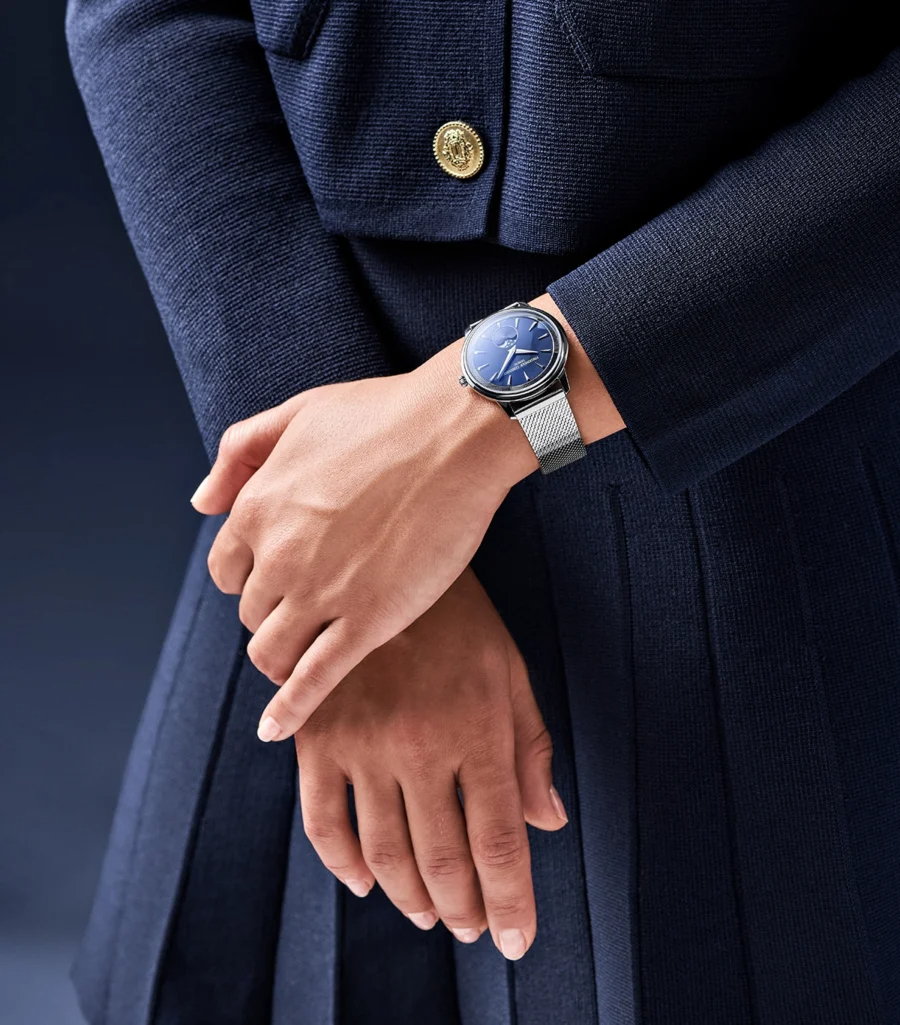 De Classics Moneta Moonphase onderscheidt zich door zijn quartz-uurwerk en elegante kast van 37 mm. Hij heeft een verfijnde maanfase op 6 uur en de naam is geïnspireerd op de rand van een munt, die subtiel is terug te vinden op de binnenring.