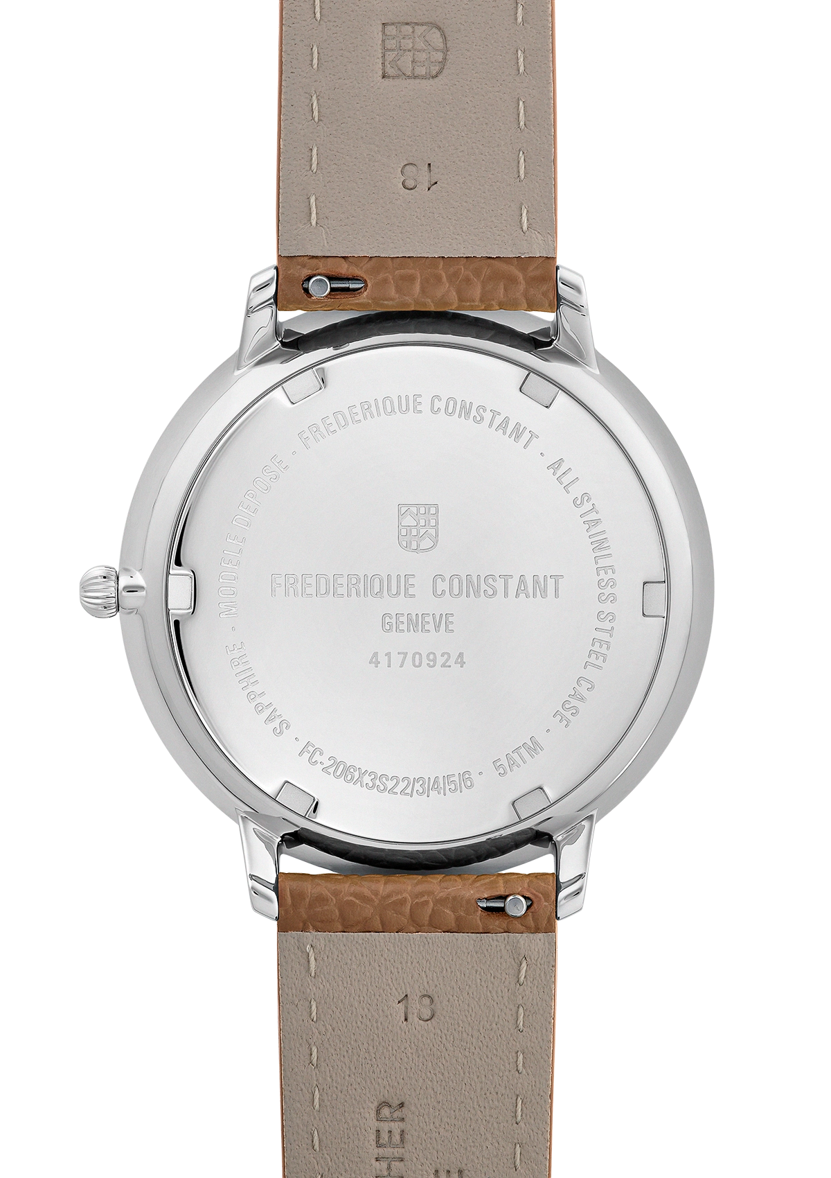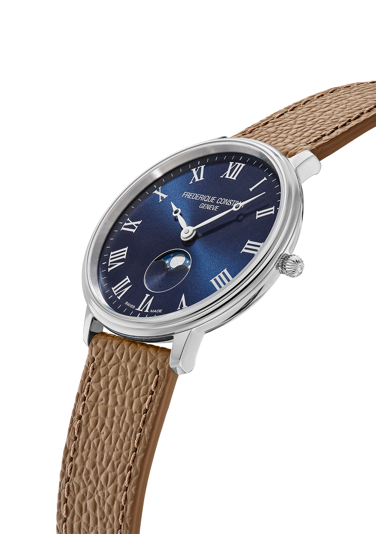 Discover the Classics Quartz Moonphase watch, a sophisticated timepiece that combines the art of watchmaking with timeless elegance. Its polished stainless steel case, measuring 39 mm in diameter and 7.65 mm in height, houses the FC-206 quartz movement, featuring 5 jewels and a remarkable battery life of 60 months. The navy blue dial, enhanced by a sunray finish, features printed white Roman numerals and white hands for perfect readability. The moon phase complication, positioned at 6 o’clock, adds a poetic touch to this refined design. Protected by a convex anti-reflective sapphire crystal and water-resistant to 5 ATM (50m/165ft), this watch is completed by a brown calfskin leather strap embossed with a grained pattern, fastened with a pin buckle, ensuring distinctive comfort and style.