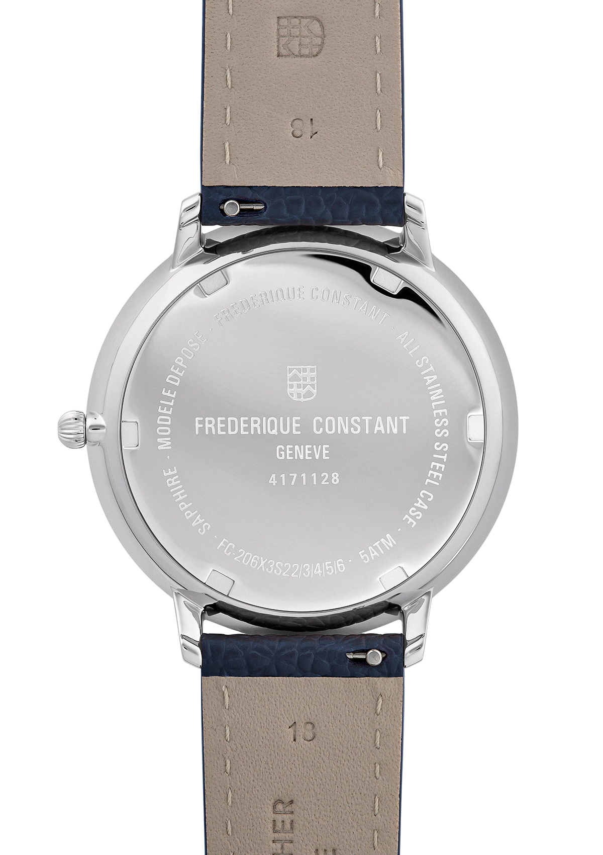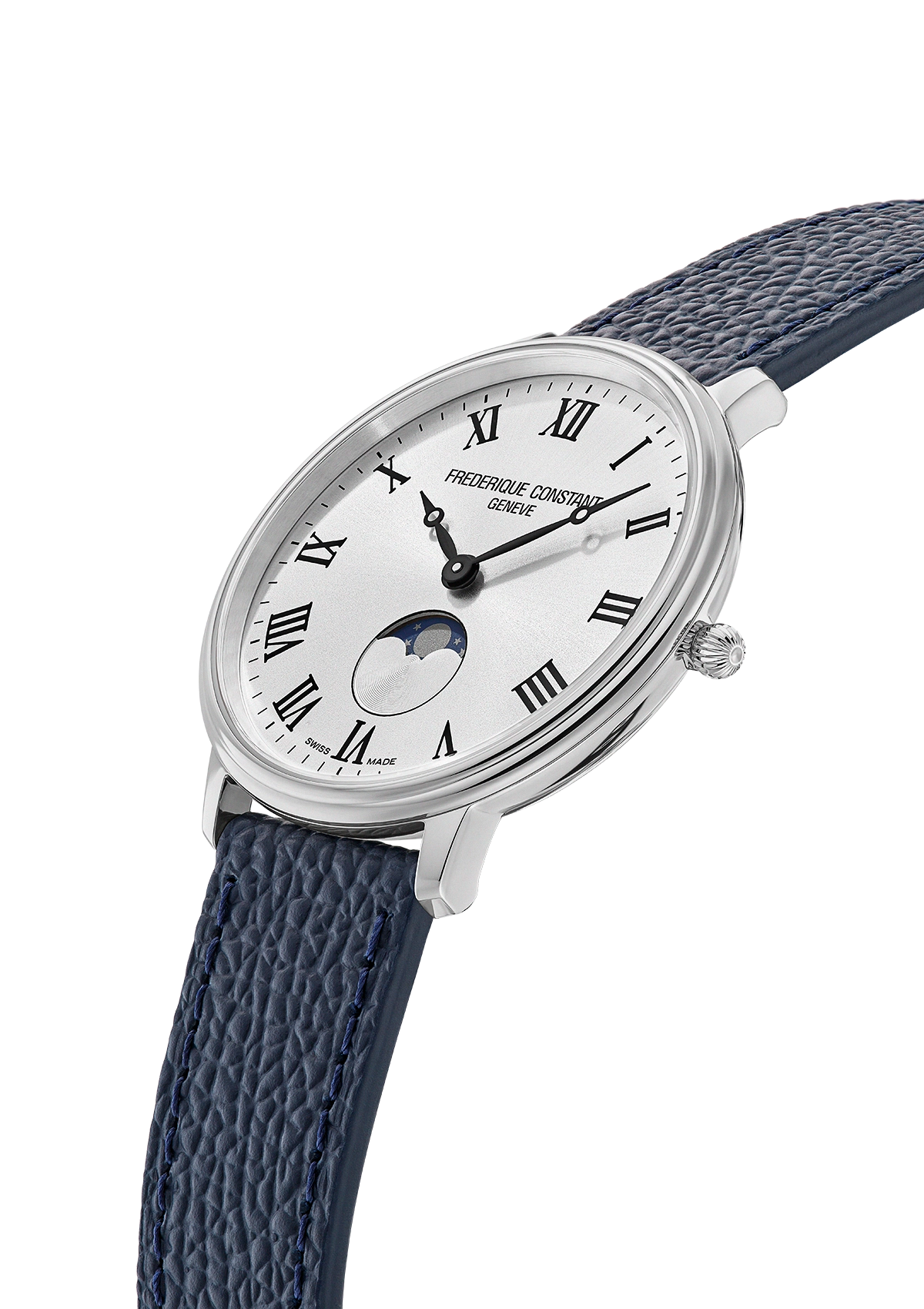 Discover the Classics Quartz Moonphase watch, a sophisticated timepiece that combines the art of watchmaking with timeless elegance. Its polished stainless steel case, measuring 39 mm in diameter and 7.65 mm in height, houses the FC-206 quartz movement, featuring 5 jewels and a remarkable battery life of 60 months. The silver dial, enhanced by a sunray finish, features printed black Roman numerals and black hands for perfect readability. The moon phase complication, positioned at 6 o’clock, adds a poetic touch to this refined design. Protected by a convex anti-reflective sapphire crystal and water-resistant to 5 ATM (50m/165ft), this watch is completed by a blue calfskin leather strap embossed with a grained pattern, fastened with a pin buckle, ensuring distinctive comfort and style for all occasions.