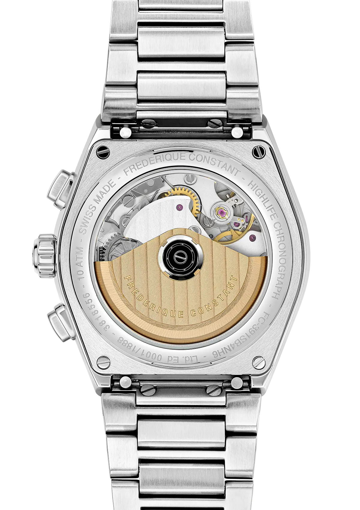 Many details have been designed to make the Highlife Chronograph Automatic subtle and unique. Respecting the hallmarks of Geneva’s fine watchmaking, the Highlife Chronograph Automatic alternates polished and brushed satin finishes on its case, its sides, and bezel. Two pushers appear, at 2 and 4 o’clock. They control the start/stop of the chronograph, as well as its reset. Their profile has been slightly tilted a few degrees so that they fit harmoniously into the profile of the case. The chronograph counters have an inward curved collar, offering a more precise reading of the chronograph indications. The fine graduation of its collar allows to read the 1/5th of a second. On the back, the case features an anti-reflective sapphire crystal that allows you to admire the automatic movement and its chronograph module – including its column wheel located at 3 o’clock.