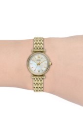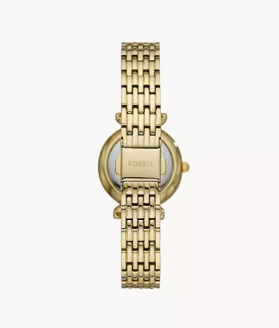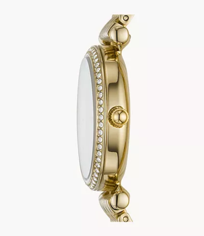 Fossil Quartz dames pols horloge staal met stalen band goudkleurig uit de collectie Carlie. 5 ATM waterdicht.