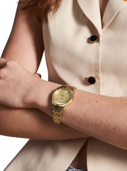 Fossil dames polshorloge model ES5338 uit de Scarlette collectie. Goudkleurige kast  32 mm en goudkleurige band met klapsluiting. Quartz uurwerk 5 ATM waterdicht.