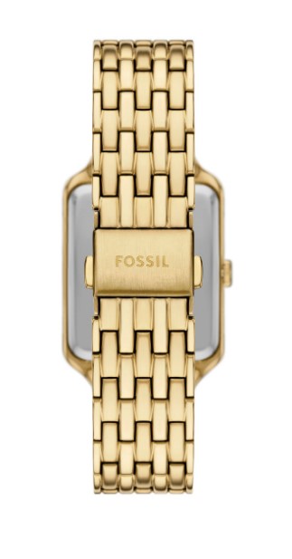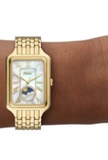 Fossil Quartz dames pols horloge staal met stalen band goudkleurig uit de collectie Raquel. Met maanstand.