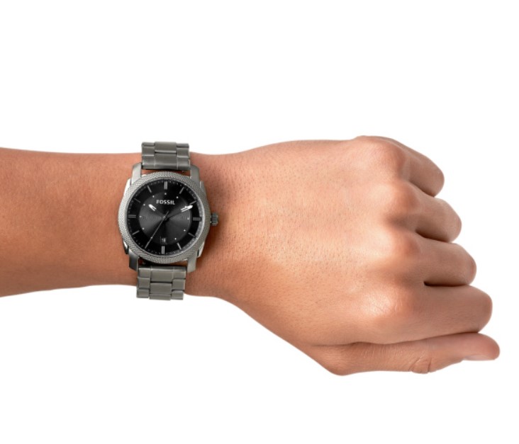 Fossil heren pols horloge uit de Machine Collectie. Gunmetal met Gunmetal band. Zwarte wijzerplaat  5 ATM waterdicht.