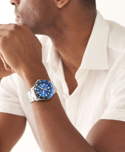 Fossil heren poslhorloge staal met stalen band blauwe wijzerplaat en blauwe kastring. 10 ATM waterdicht