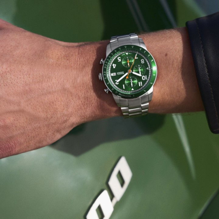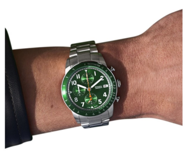 Fossil heren pols horloge staal met stalen band uit de Sport Tourer Collcetie. Groene wijzerplaat quartz chronograaf. 5 ATM waterdicht.