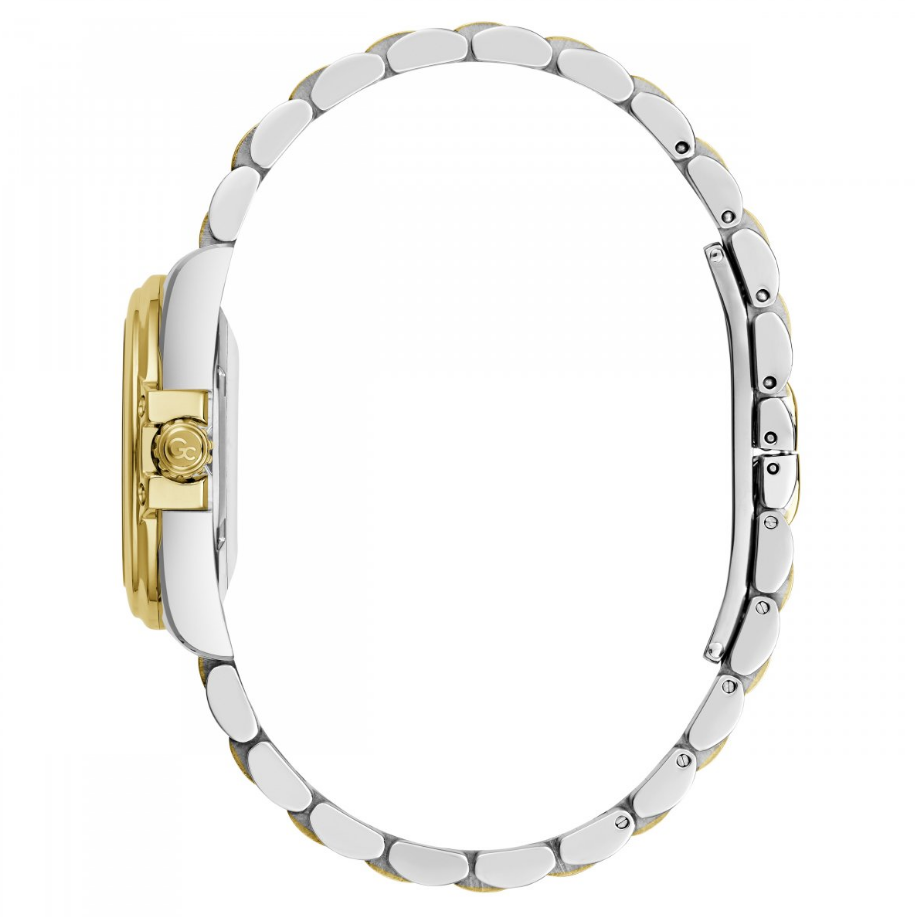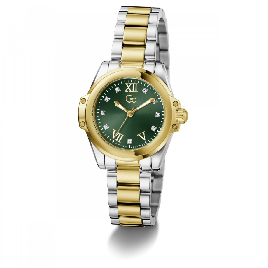 Goud- en zilverkleurig dameshorloge van Gc met donkergroene wijzerplaat. Het horloge combineert elegantie met functionaliteit en straalt verfijning uit. De bicolor afwerking zorgt voor een tijdloze uitstraling die bij elke gelegenheid past.  De kristallen op de wijzerplaat en de schroefdetails op de kast maken het horloge helemaal af.
