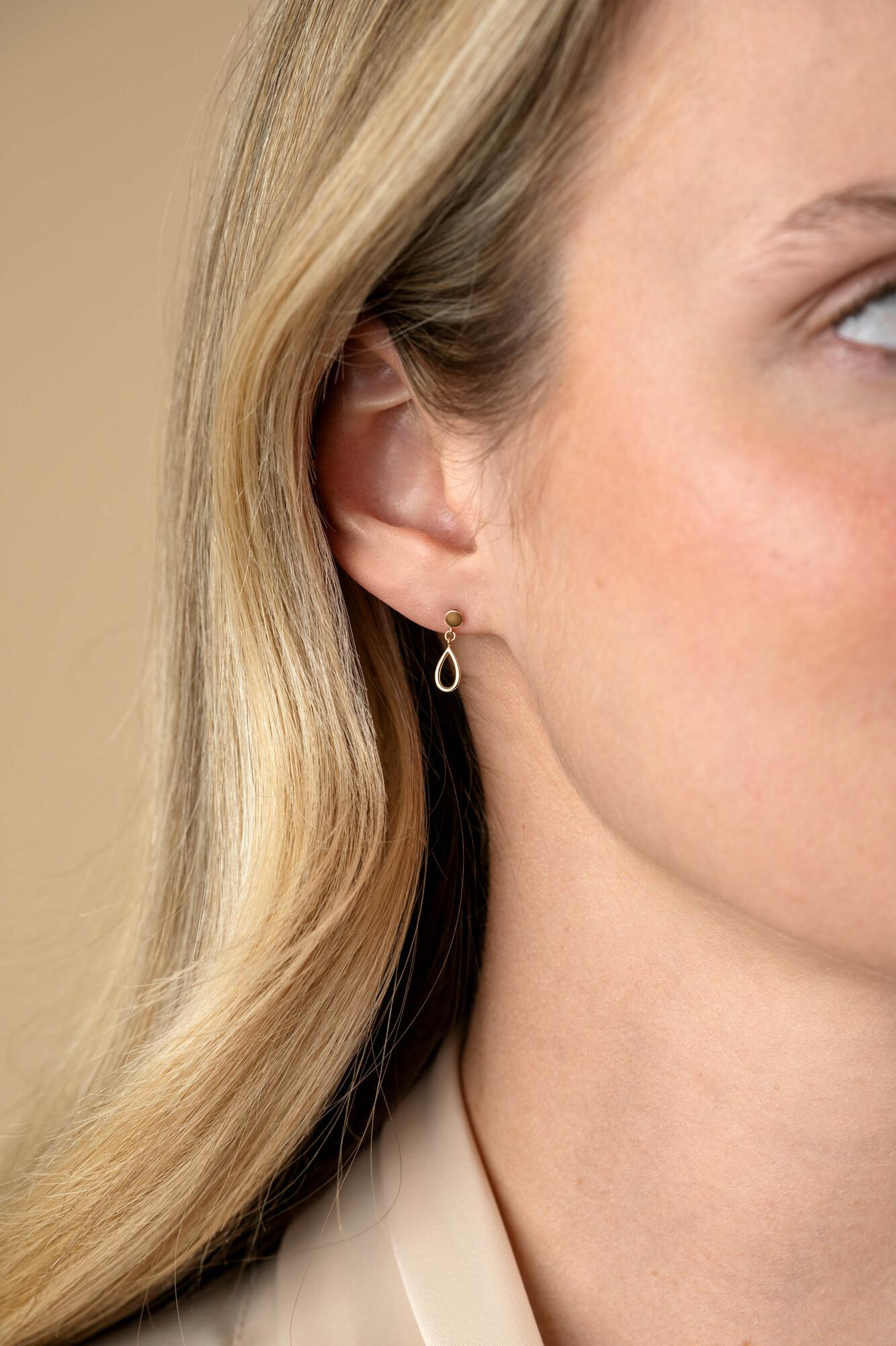 ZINZI Gold 14 karaat gouden oorstekers met een hangende open druppelvorm. Deze hangt sierlijk aan de platte ronde oorsteker. De oorstekers zijn 13mm lang. Vervaardigd van geheel 14 karaat goud (585).