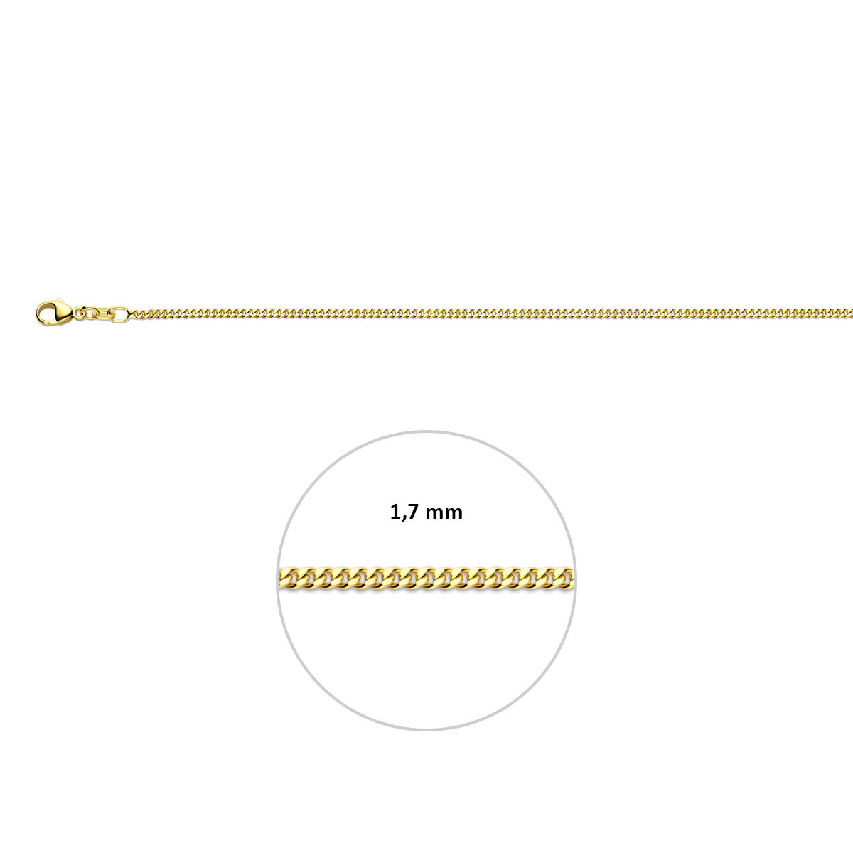 14 Karaat geel goud Gourmet collier 50 cm lang 1.7 mm schakelmaat met karabijn haak sluiting.