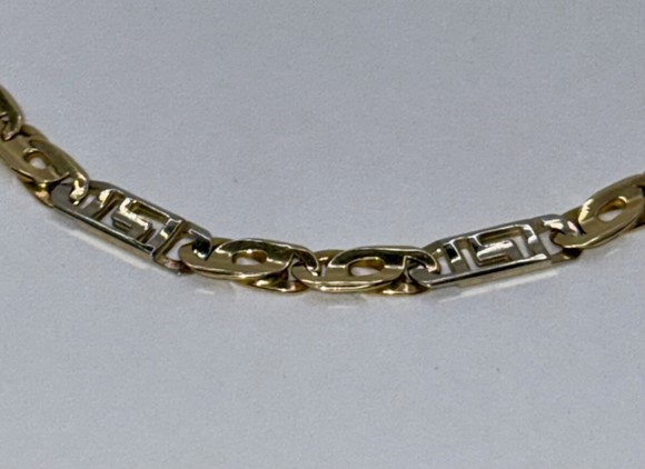 14 Karaat bicolor massief geel- met witgouden fantasie collier schakelbreedte 4.5 mm met luxe karabijn sluiting 45 cm lang.