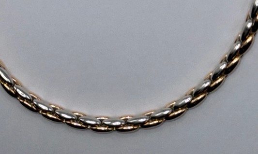 14 Karaat prachtig wit met rose gouden collier met een klasieke schakel breedte 5 mm en een draaglengte van 45 cm met karabij sluiting.