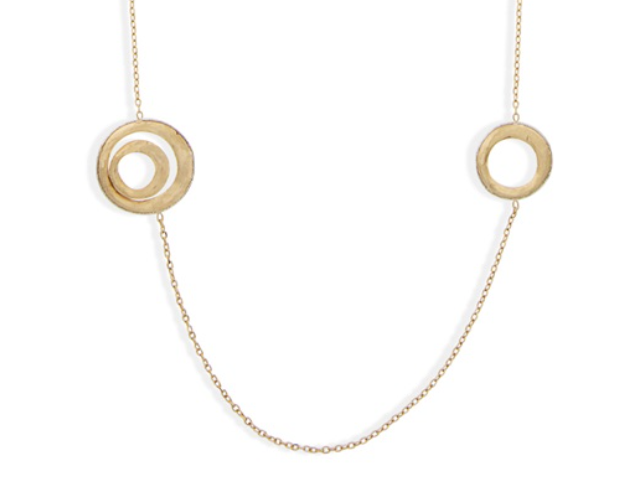 14 karaat geel goud lang anker collier met 5 maanvormige gematteerd bewerkte ornamenten met een witgouden omlijsting 70cm lang en karabijn sluiting.
