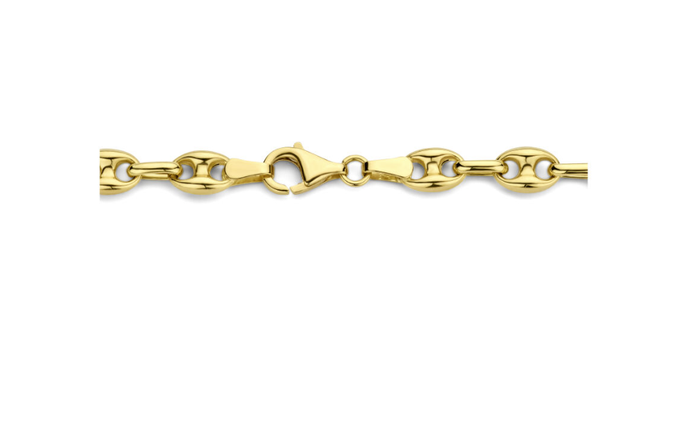 14 karaat massief Geelgouden koffieboon collier met een draaglengte van 43cm. Het collier is uitgevoerd met een karabijn sluiting. De schakelbreedte is 4,9 mm.