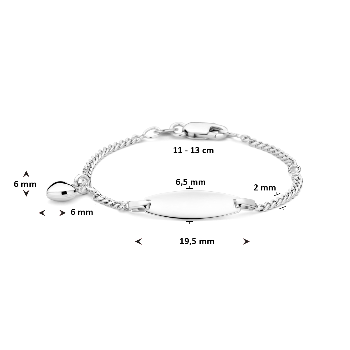 Gerhodineerd 925 zilveren graveerarmband uitgevoerd met een hartje. De armband heeft draaglengtes van 11-13cm en een schakelbreedte van 2mm. Het graveerplaatje heeft een afmeting van 6.5x19.5mm.