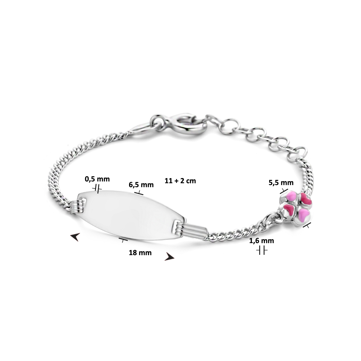 Gerhodineerd 925 zilveren graveerarmband uitgevoerd met een klavertje. De armband heeft een draaglengte van 11cm en een extensie van 2cm. De schakelbreedte is 1.6mm. De graveerplaat heeft een dikte van 0.5mm.