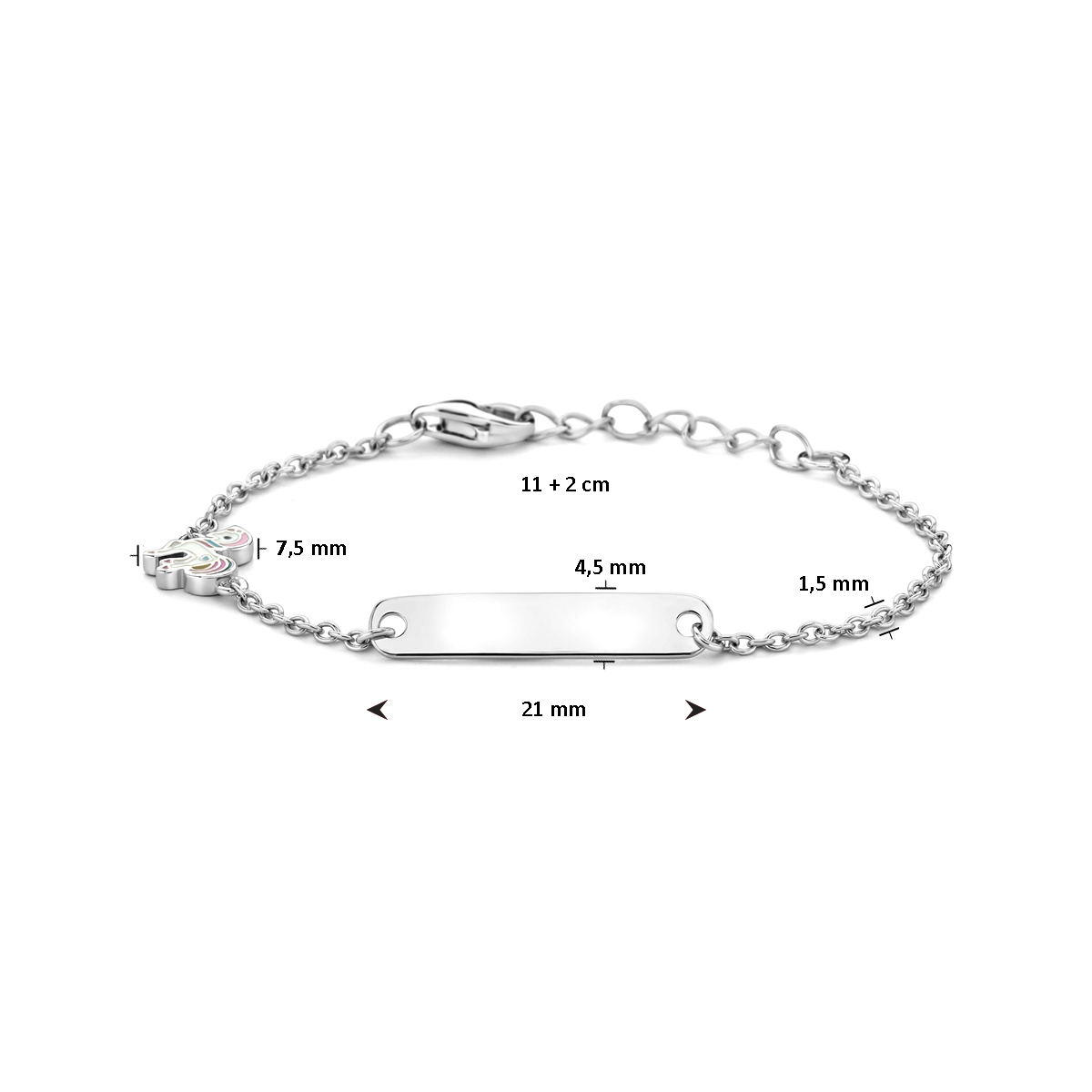 Gerhodineerd 925 zilveren graveerarmband uitgevoerd met een eenhoorn. De armband heeft een schakelbreedte van 1.5mm en een draaglengte van 11cm met 2cm extensie. De graveerplaat heeft een afmeting van 4.5x21mm en een dikte van 0.6mm.