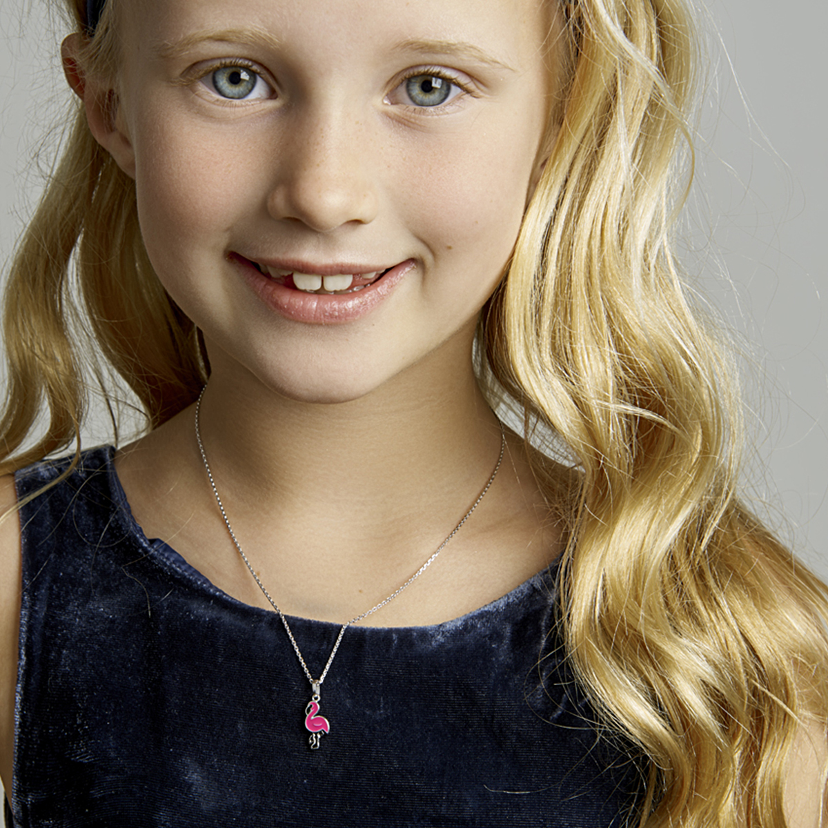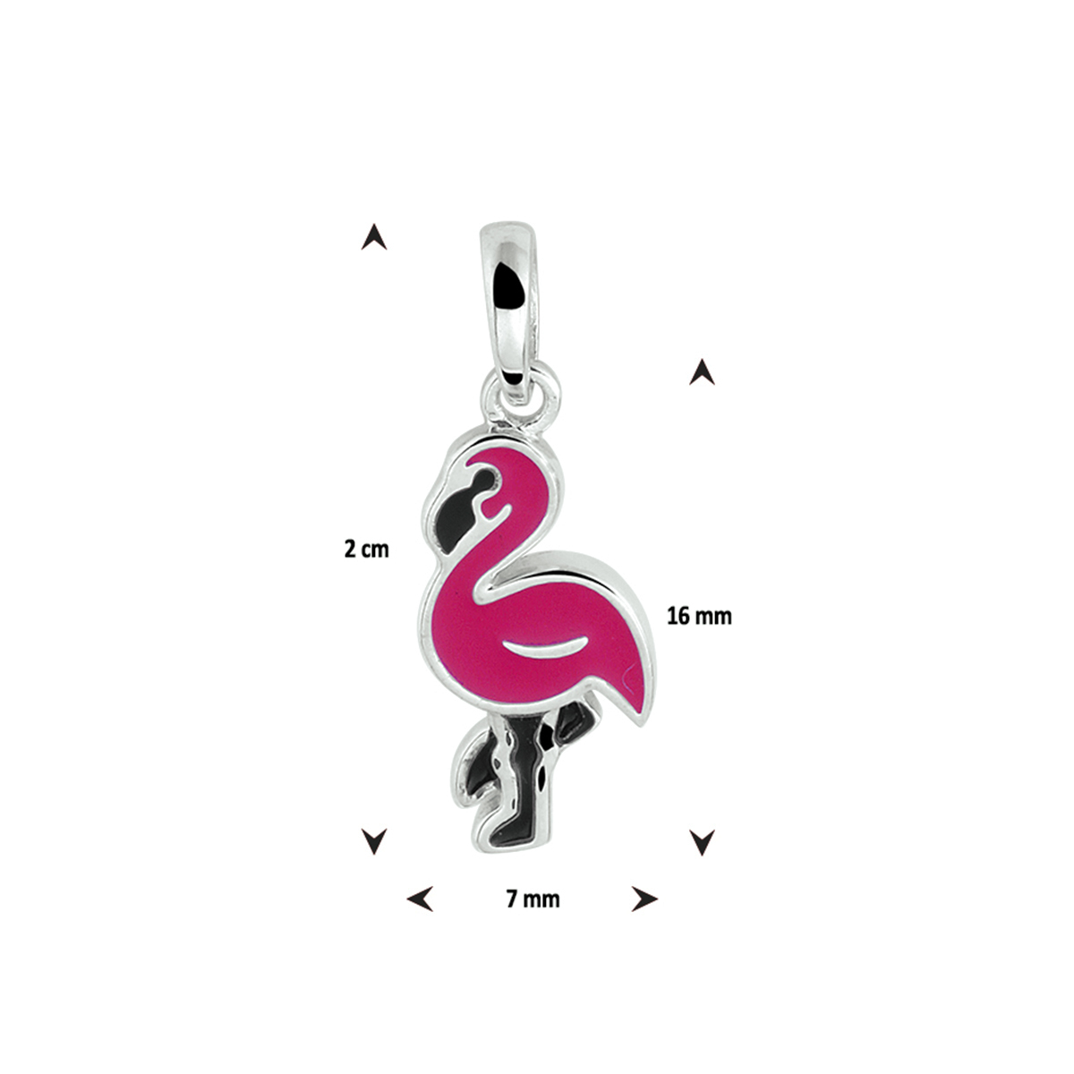 Gerhodineerd zilveren hanger in de vorm van een flamingo uitgevoerd met emaille. De hanger heeft een totale hoogte van 20mm.