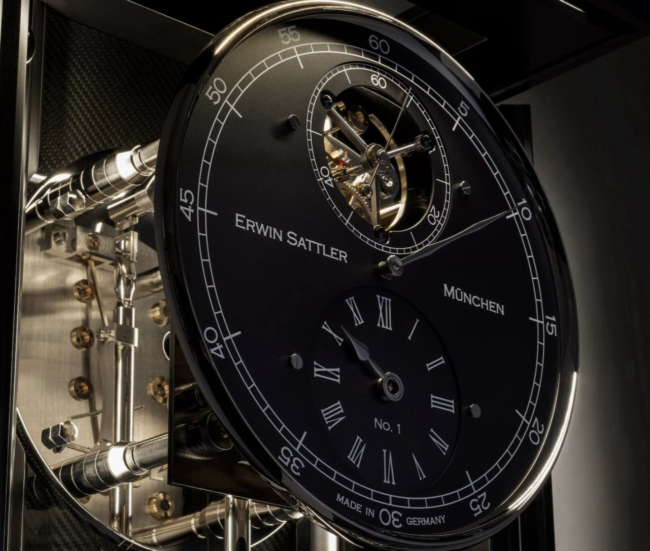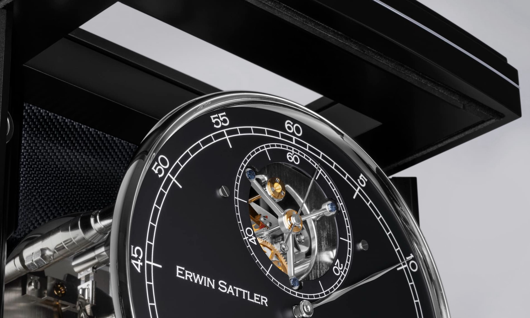 Exclusieve staande klok van Erwin Sattler model Illumina Secunda. Een moderne en innovatieve herinterpretatie van de traditionele staande klok in een moderne behuizing. Met zijn gebogen oppervlakken en gepolijste inlegwerk wordt het precisie-uurwerk met secondeslinger niet alleen beschermd, maar schittert het ook door de ingebouwde ledverlichting.  Niet alleen in de binnenkant van de kast, maar dat er ook indirecte verlichting aan de achterzijde van de kast.