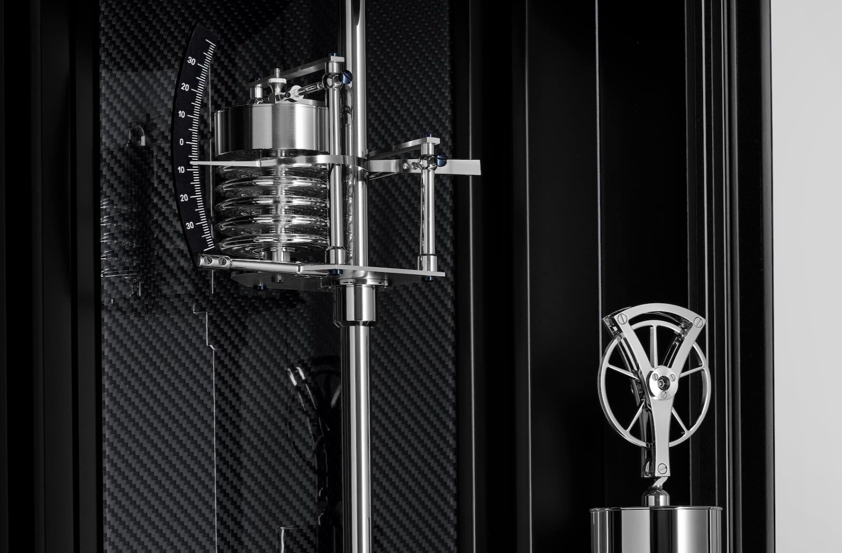 Het precisie slinger uurwerk met is voorzien van een nieuw ontworpen, driedelige wijzerplaat met verzonken en zichtbare ankergang. De klok is leverbaar met twee verschillende wijzerplaten. In de bodem van de kast is een verborgen bergruimte gerealiseerd.