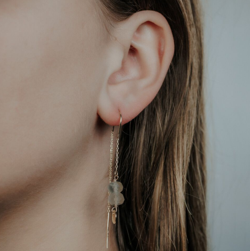 Doortrek oorbel van Jéh Jewels met grijze Maansteen. Deze populaire oorbellen zijn er nu ook met een mooie Maansteen. De oorbel is elegant en kan perfect gecombineerd worden met een collier, ring en armband.