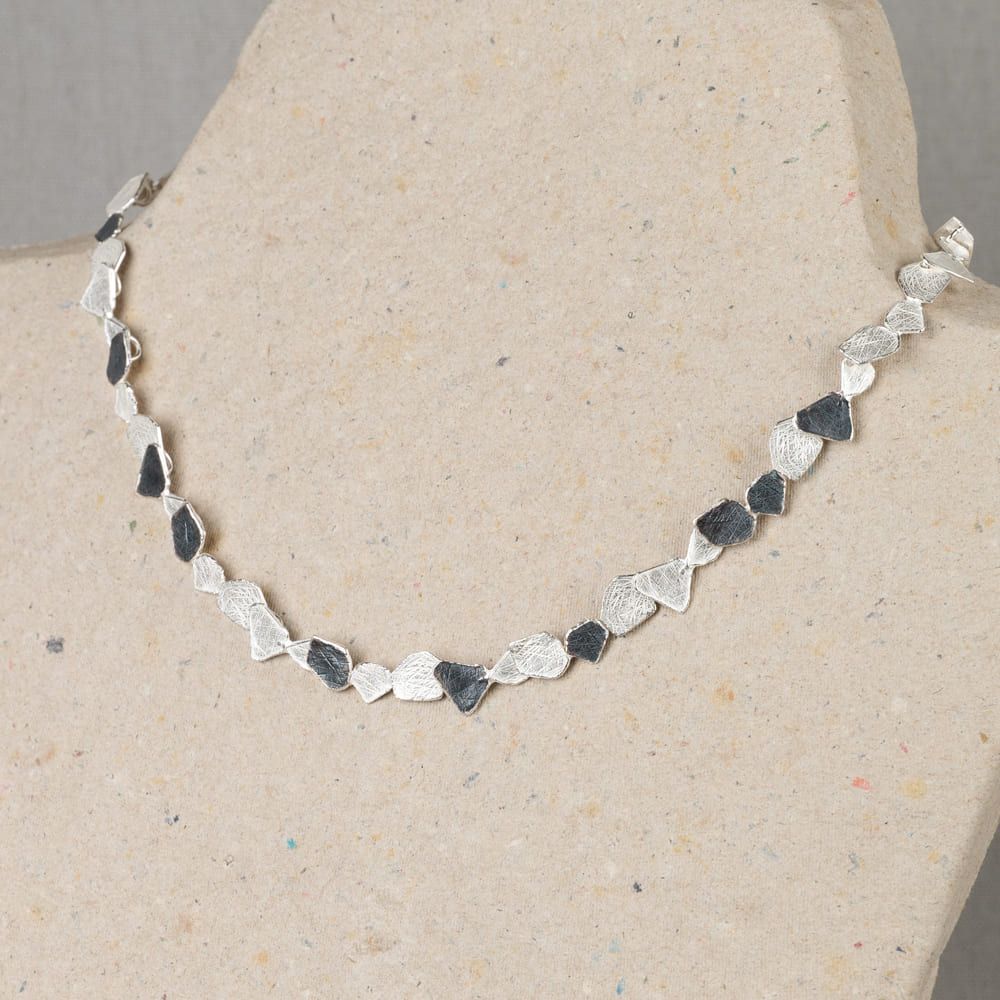 Dit collier is gemaakt van 925 sterling zilver. Enkele schakels zijn geoxideerd wat zorgt voor een mooi zwart-wit patroon. De schakels zelf hebben een leuke en afwisselende organische vormen.