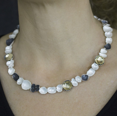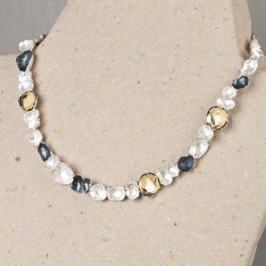 Collier gemaakt van 925 sterling zilver, geoxideerd zilver en zilver verguld. Dit schakelcollier is door de drie kleuren en verschillende organische schaaltjes een echt Jéh collier.