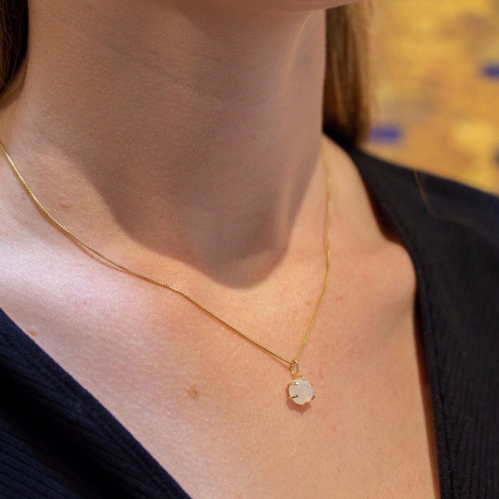 Collier van Jéh Jewels gemaakt van verguld zilver en maansteen. Dit prachtige collier is gemaakt van maansteen met daaromheen verguld zilver. Ook het kettinkje zelf is van verguld zilver.