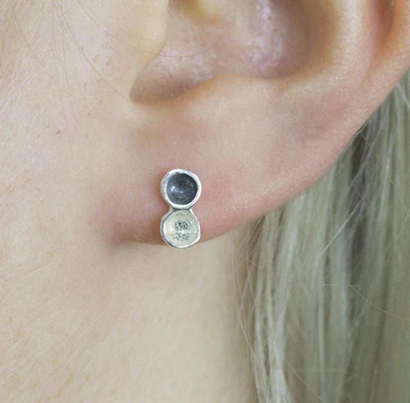 Oorsteker domino. Kommetje in geoxideerd en wit zilver.