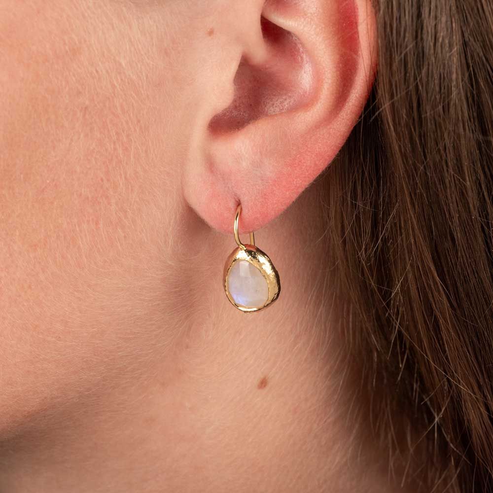 Oorhangers gemaakt van zilver verguld in combinatie met de edelsteen Regenboog Maansteen. Deze oorbellen zijn ook verkrijgbaar met Labradoriet en we hebben ze ook in een slag kleiner. Combineer met een mooi collier voor een complete set.