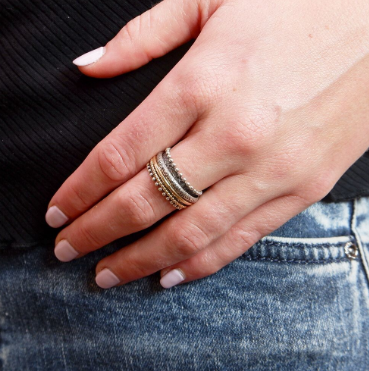 Ring van Jéh Jewels gemaakt van geoxideerd zilver, en goldfilled. Deze lieve ring heeft, net als vele van onze ringen, goldfilled bandjes die in het midden kunnen draaien. De bolletjes aan de zijkant maken deze ring extra leuk!
