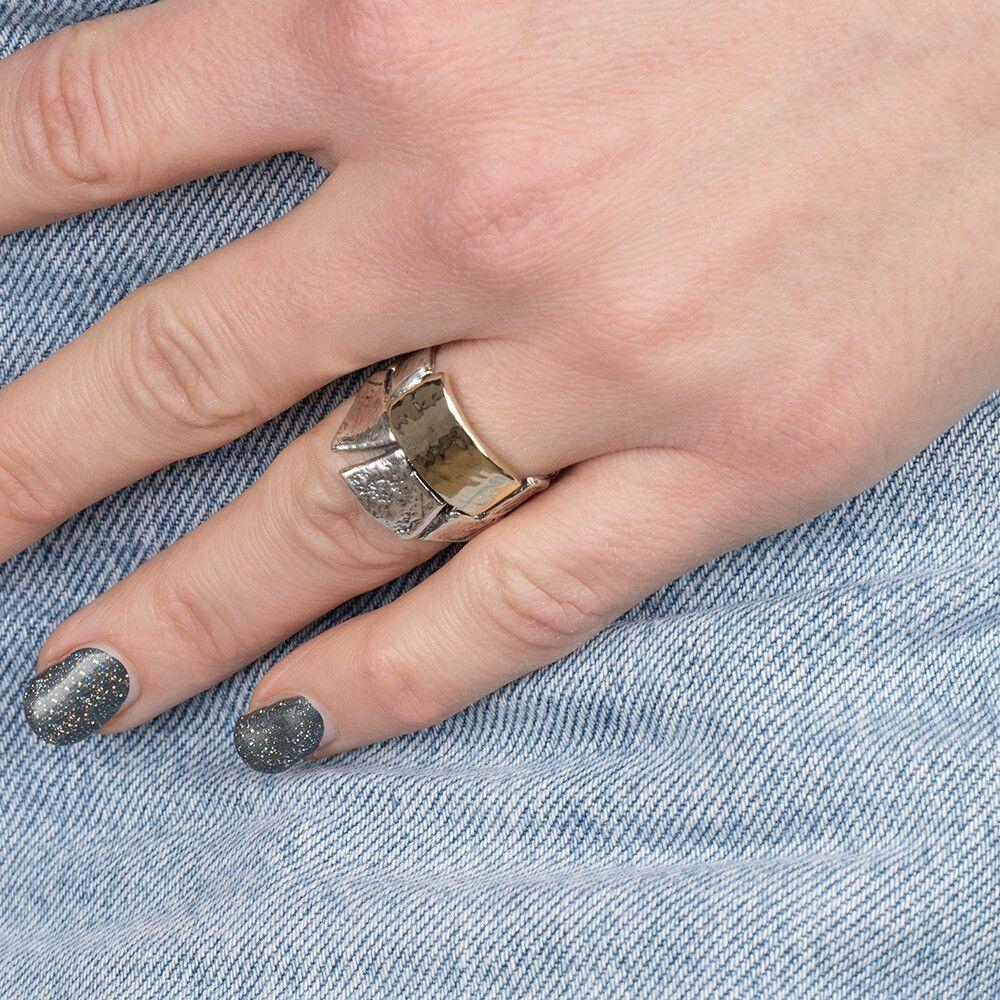 Ring gemaakt van 925 sterling zilver geoxideerd zilver en 9 karaat. Hij is creatief en heeft een ambachtelijke look. Combineer deze ring met een mooi collier en oorsieraden.