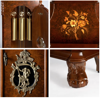 Topkwaliteit hoogglans gepolijst 3 melodieën Kieninger kabel uurwerk met naar keuze instelbaar automatische melodie omschakeling. Automatische nachtuitschakeling tussen 22.00 en 7.15 uur.